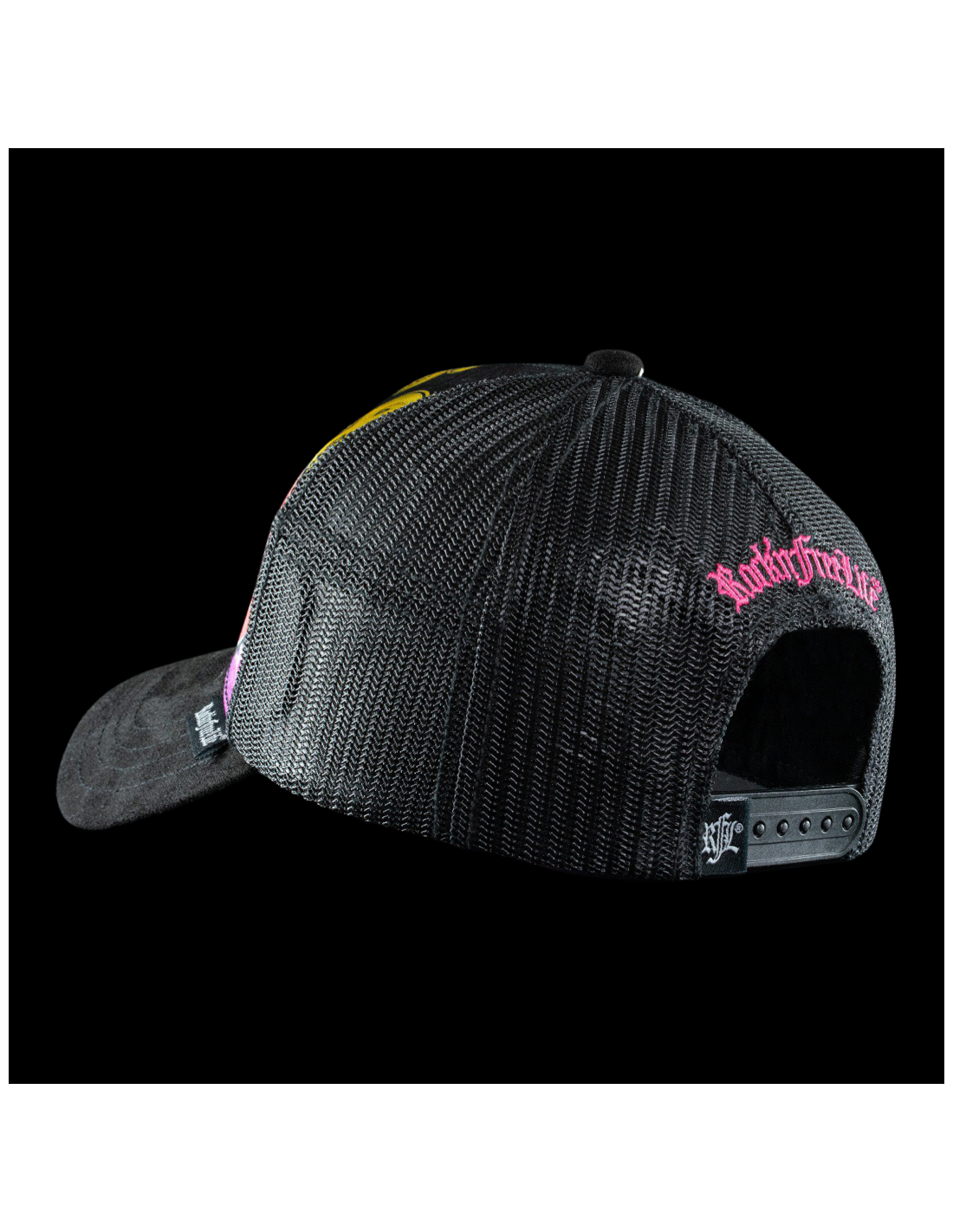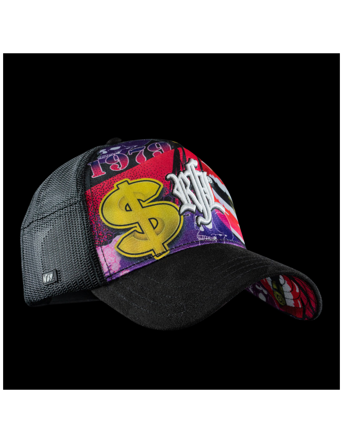 - Visière arrondie noire sur le dessus, dessous print sur tissu satiné inspiration peinture bobber