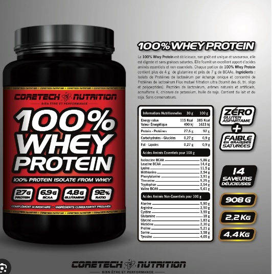 100% whey de coretech-nutrition est la source de protéine de référence pour la construction musculaire. En effet, 100% whey Protéine sans lactose est une source de protéine hautement assimilable avec 22 gr de protéines sélectifs et très digestes, il soutient la prise de masse sèche, les phases de définition musculaire et aussi la récupération musculaire.