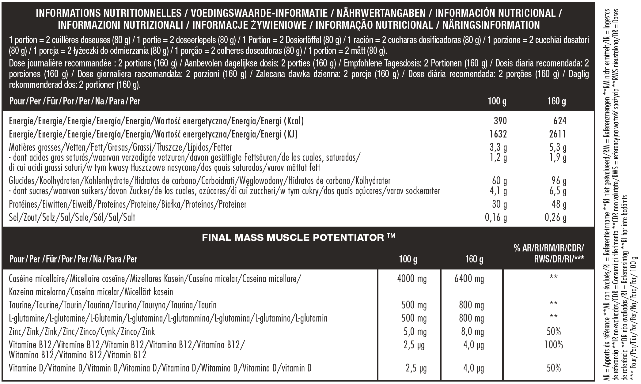 FINAL MASS TM est une délicieuse formule de glucides et de protéines de très haute qualité, scientifiquement développée pour les athlètes exigeants ayant des besoins supérieurs en nutriments spécifiques pour la prise de masse musculaire. FINAL MASS TM est destiné à ceux qui recherchent le meilleur en matière de performance et de nutrition sportive. FINAL MASS TM dispose d’une triple source de protéines dont la caséine micellaire et la whey isolate, ansi que de glucides à indice glycémique bas qui limitent la conversion des sucres en graisses, et sont assimilés par le corps sur une durée plus longue.