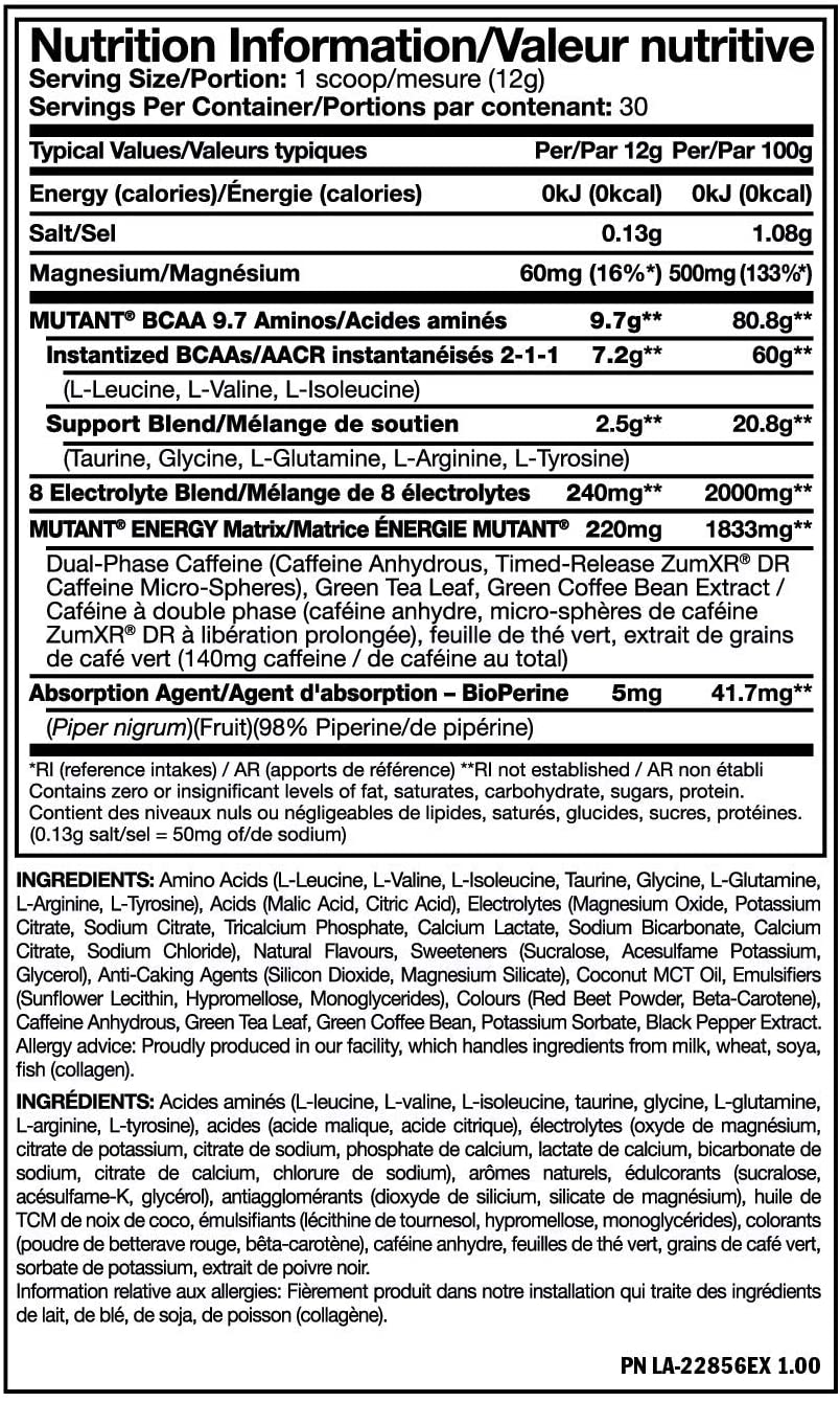 MUTANT BCAA 9.7 ENERGY commence avec 9,7 grammes de BCAA végétaliens, d’EAA et d’autres acides aminés de forme libre pour optimiser la récupération. Pour vous accompagner même dans les entraînements les plus difficiles, chaque portion contient également un système de distribution d’inspiration pharmaceutique pour disperser un coup de café instantané et à libération programmée pendant votre entraînement. La première explosion de puissance entre en action immédiatement, suivie d’une deuxième vague d’énergie une heure plus tard. Cela maintient votre endurance constante tout au long de votre entraînement. BCAA 9.7 ENERGY vous offre un approvisionnement énergétique propre et stable sans aucun accident! La formule comprend également huit électrolytes recherchés pour garder vos muscles hydratés pendant que vous dynamisez vos performances au maximum. BCAA 9.7 ENERGY peut également être utilisé les jours sans entraînement chaque fois que vous avez besoin d’un regain d’énergie.