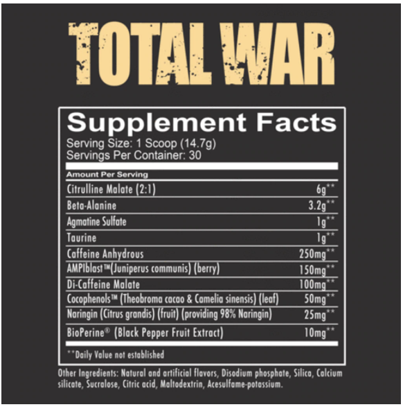 Que vous vous entraîniez avant le travail ou l’école, milieu de journée, ou plus tard dans la soirée Total War vous réveillera a coup sur ! La puissante combinaison de stimulants mise au point ainsi que les composés d’oxyde nitrique, fait de Total War un supplément tout en un.