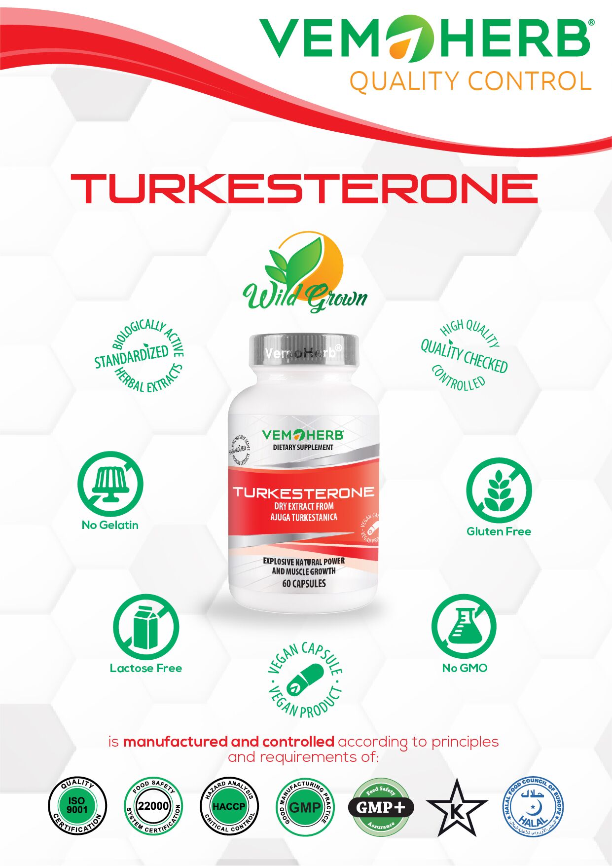 VemoHerb® Turkesterone est basé sur un extrait sec d’Ajuga turkestanica, standardisé à un minimum de 10% de turkesterone. La turkesterone est un phytoecdystéroïde, présent dans les plantes. Les ecdystéroïdes, ainsi que la testostérone, ont la capacité d’induire la croissance musculaire dans l’organisme humain. Cependant, ils sont préférés à la testostérone, car aucun effet secondaire stéroïdien, comme la gynécomastie ou la perte de cheveux, n’est associé à leur consommation.