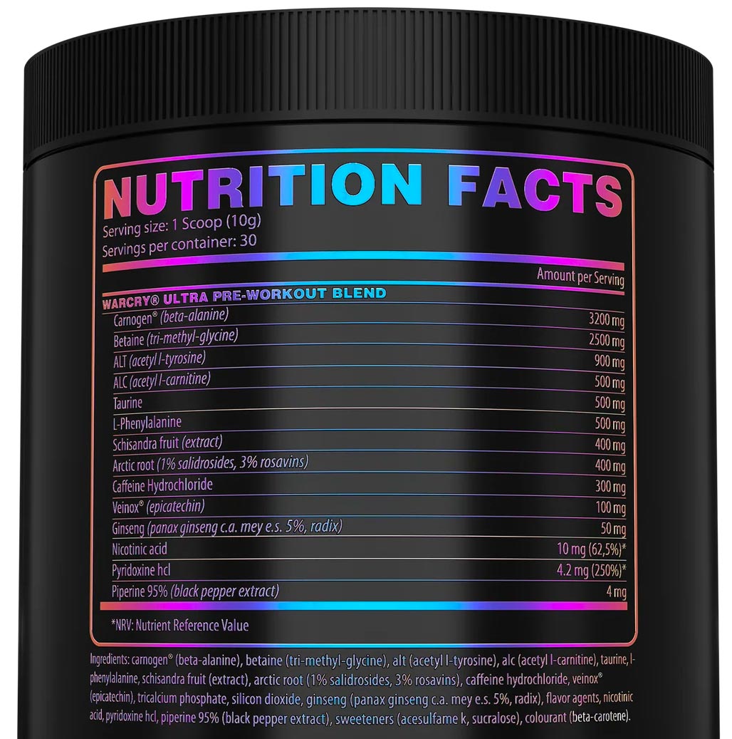 WARCRY® ULTRA 300g/30serv est une symphonie de science et de création, orchestrée dans un pré-entraînement qui vous fournit tous les ingrédients nécessaires pour vous transformer en une divinité de la performance. Chaque portion vous emmène dans un voyage vers les sommets de l’élévation physique et mentale, alors que vous vous préparez à conquérir le gymnase.